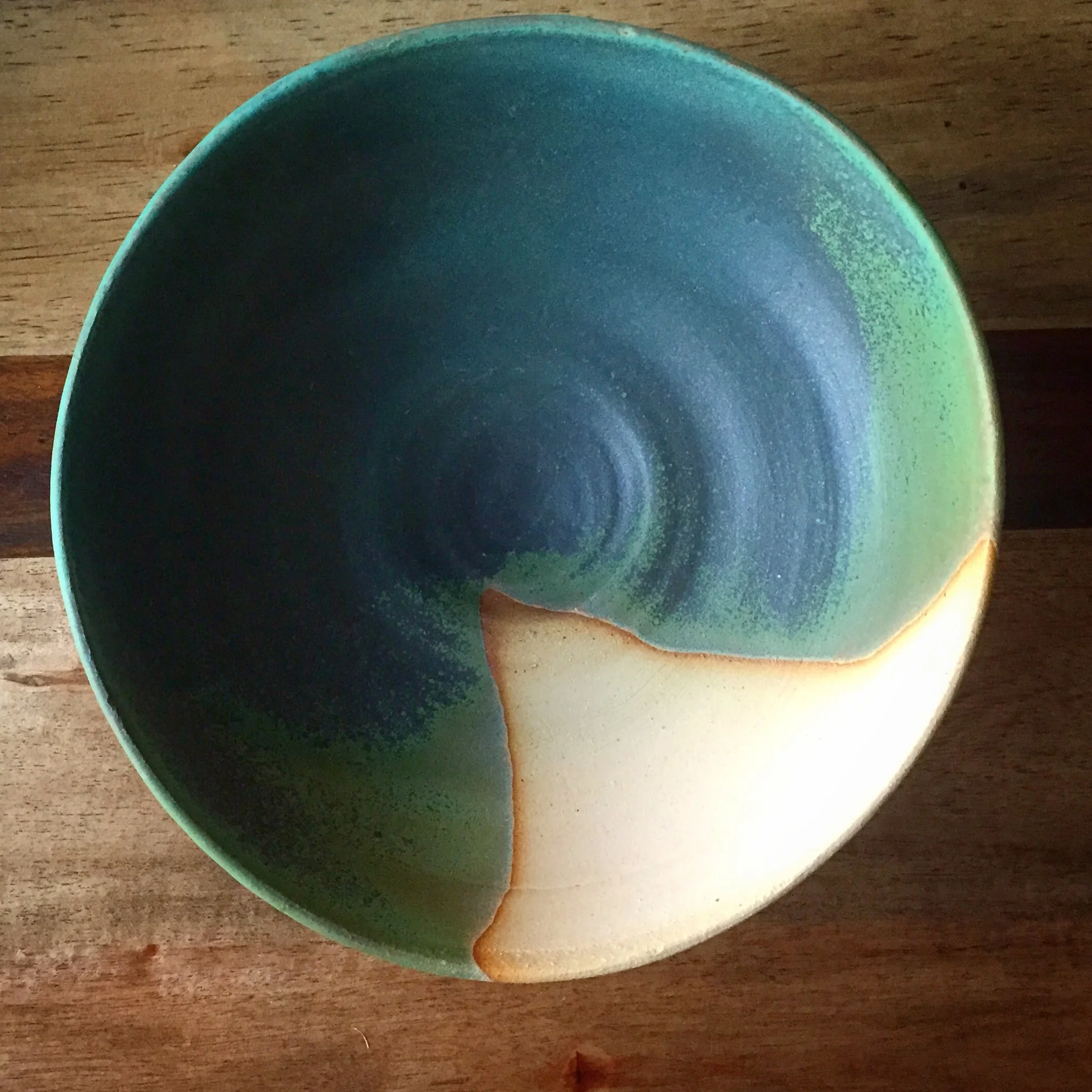 An exploration in glazing process; this is one of the first bowls thrown after a hiatus from ceramic arts. The firing process creates a unique burnished edge to the un-glazed portion of the bowl.